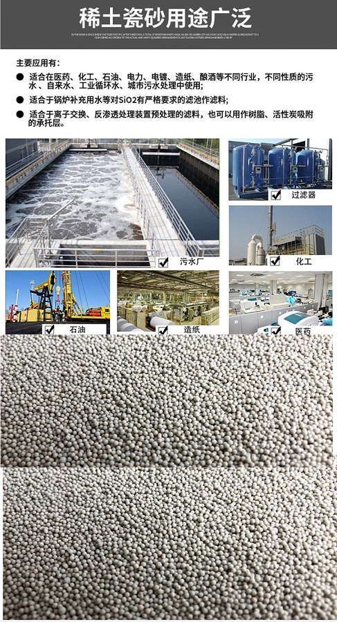 瓷砂濾料是一種球形顆粒,具有很好的穩(wěn)定化學(xué)性能,強度高,耐高溫 耐腐蝕比表面積大,截污吸附性能好,顆粒均勻,比重適中。稀土瓷砂濾料含油增強及耐腐蝕性的稀土,具有瓷砂濾料的性能外,吸附性能增強,化學(xué)穩(wěn)定性能好,適合做反滲透過濾和超濾介質(zhì)。 在單層濾池 雙層濾池 雙層過濾器,離子交換器等過濾上班中作過濾介質(zhì)及墊層,可以處理各種工業(yè)污水 工業(yè)用水 城市污水等。